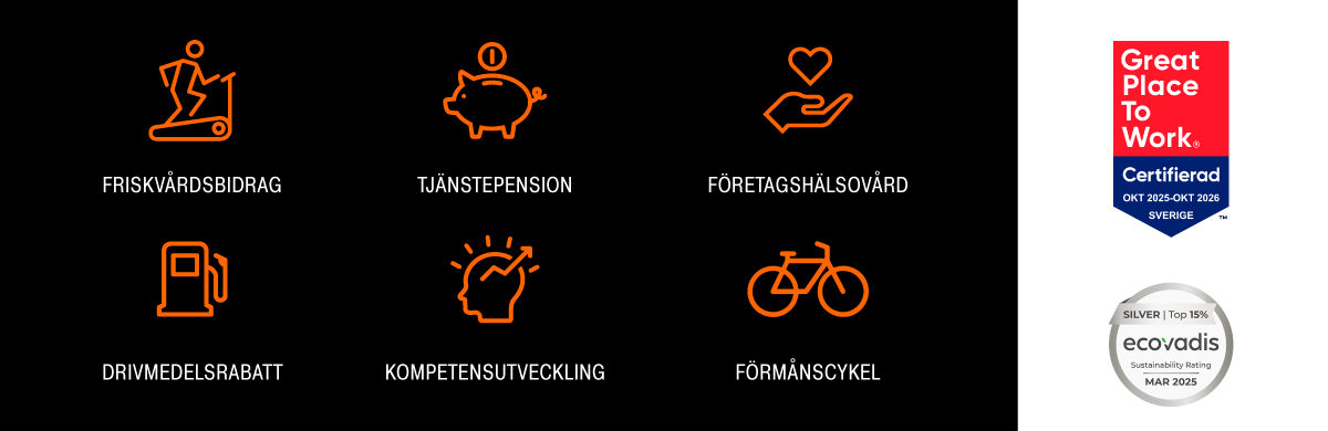 Vi är en trygg och stabil arbetsgivare. Kollektivavtal och tjänstepension är en självklarhet för oss. Vi är dessutom ISO-certifierade i Sverige, vilket innebär att vi måste leva upp till höga krav – bland annat avseende en säker och bra arbetsmiljö. -